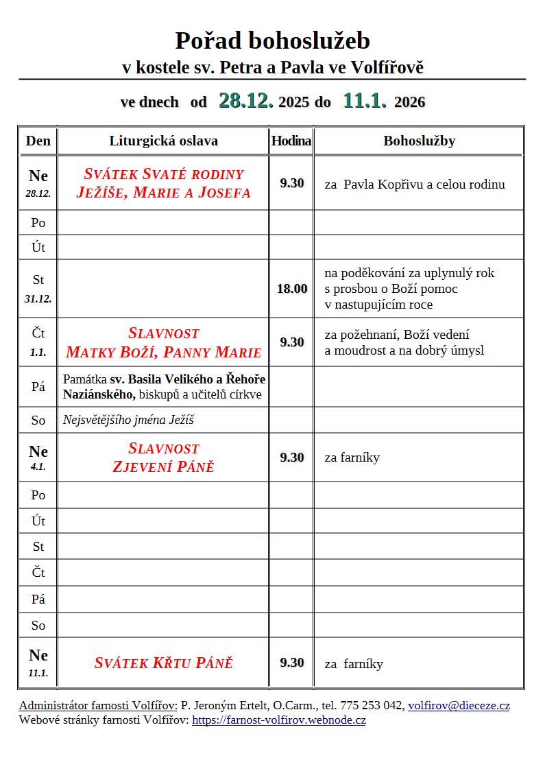 Pravidelná nedělní bohoslužba je v neděli v 9:30 hodin. O slavnostech připadajících na všední den je mše svatá v 18:00 hodin. Pokud slavnost připadá na den, kdy je státní svátek, tak je mše svatá jako v neděli v 9:30 hodin.